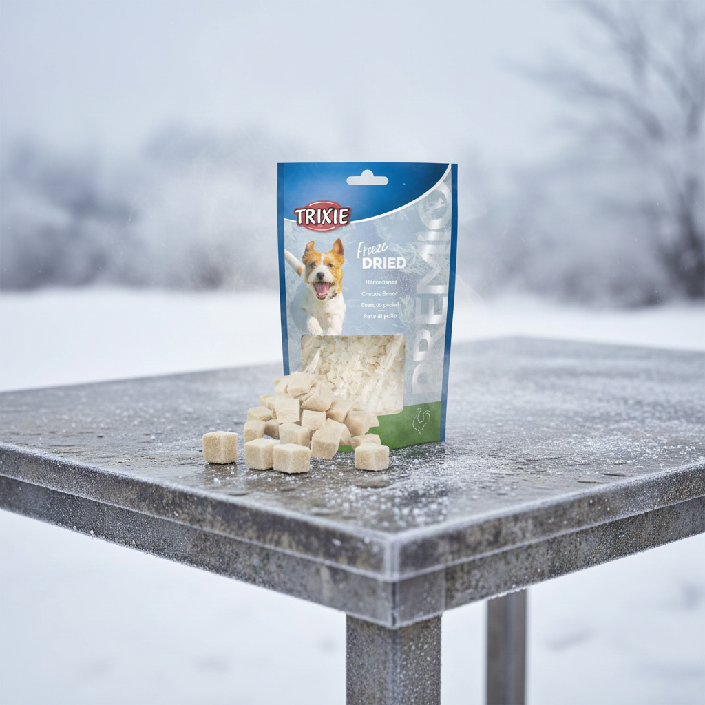 Trixie Premio Freeze-Dried Chicken Breast is a natural, high-protein snack for pets, made using a gentle process that preserves both flavor and nutrients. It is particularly suitable as a healthy reward or appetite stimulator for animals with food allergies or sensitive stomachs.