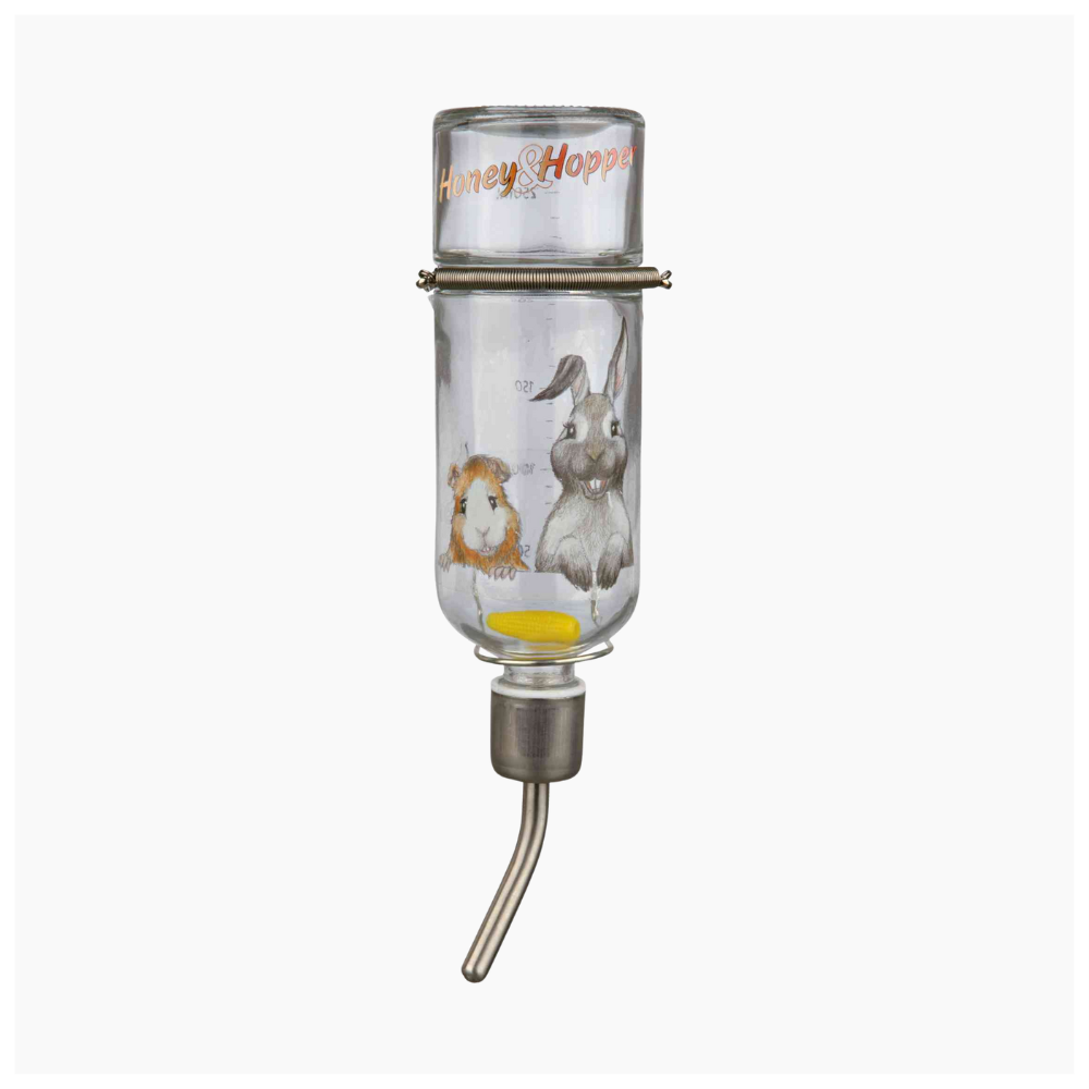 Glass bottle with stainless steel cap/drinking tube with ball valve. Bite-proof. Floater allows easy checking of water level. Secure attachment through tension spring/slot and wire holder.