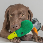 Soft plush duck design dog toy with different textures for mouths to explore. 40cm from beak to feets. Squeaker inside (doesn’t honk).