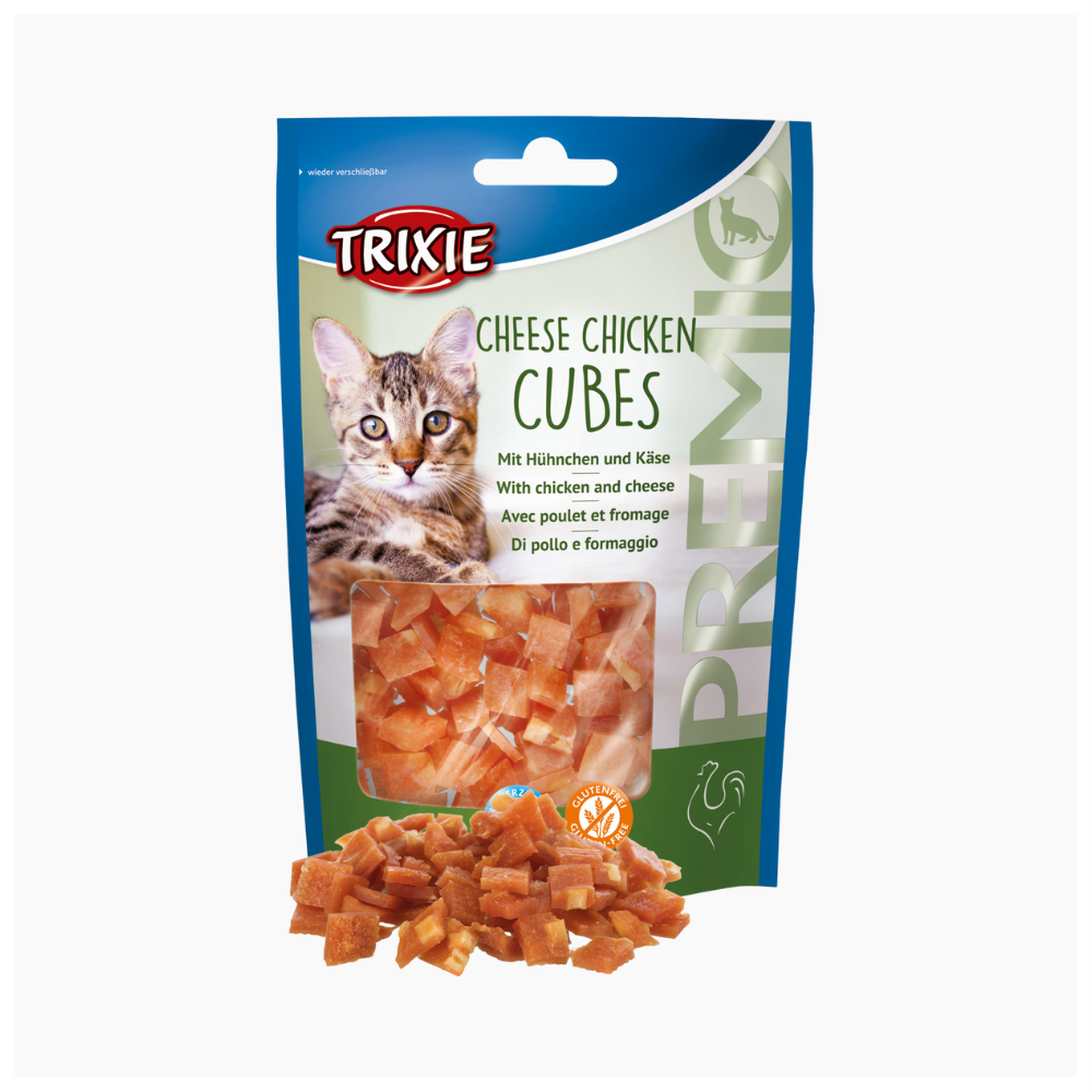 chicken breast (81 %), cheese (4 %), glycerine, potato starch, minerals. Gluten-free formula. No added sugar