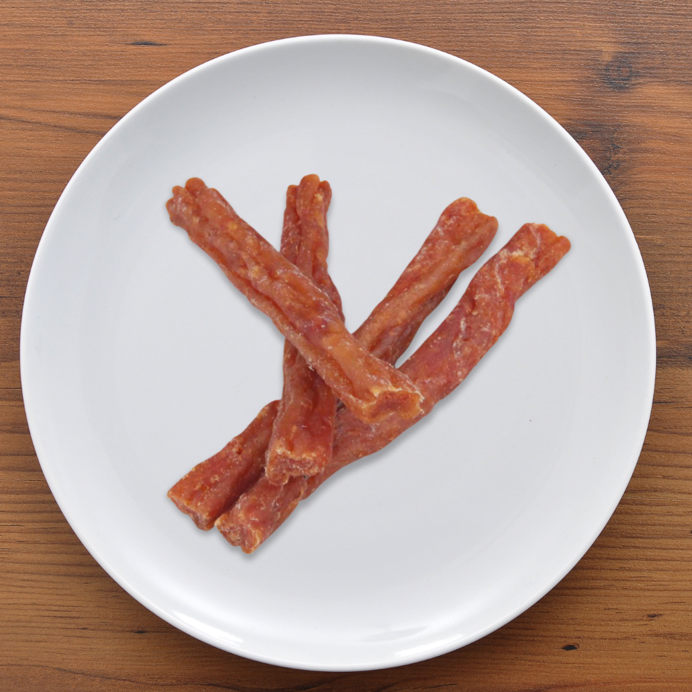 Composition – Chicken breast (70 %), soy protein, rice flour, glycerine, sweet potato starch, minerals. Gluten-free formula. No added sugar. Store in a cool and dry place.